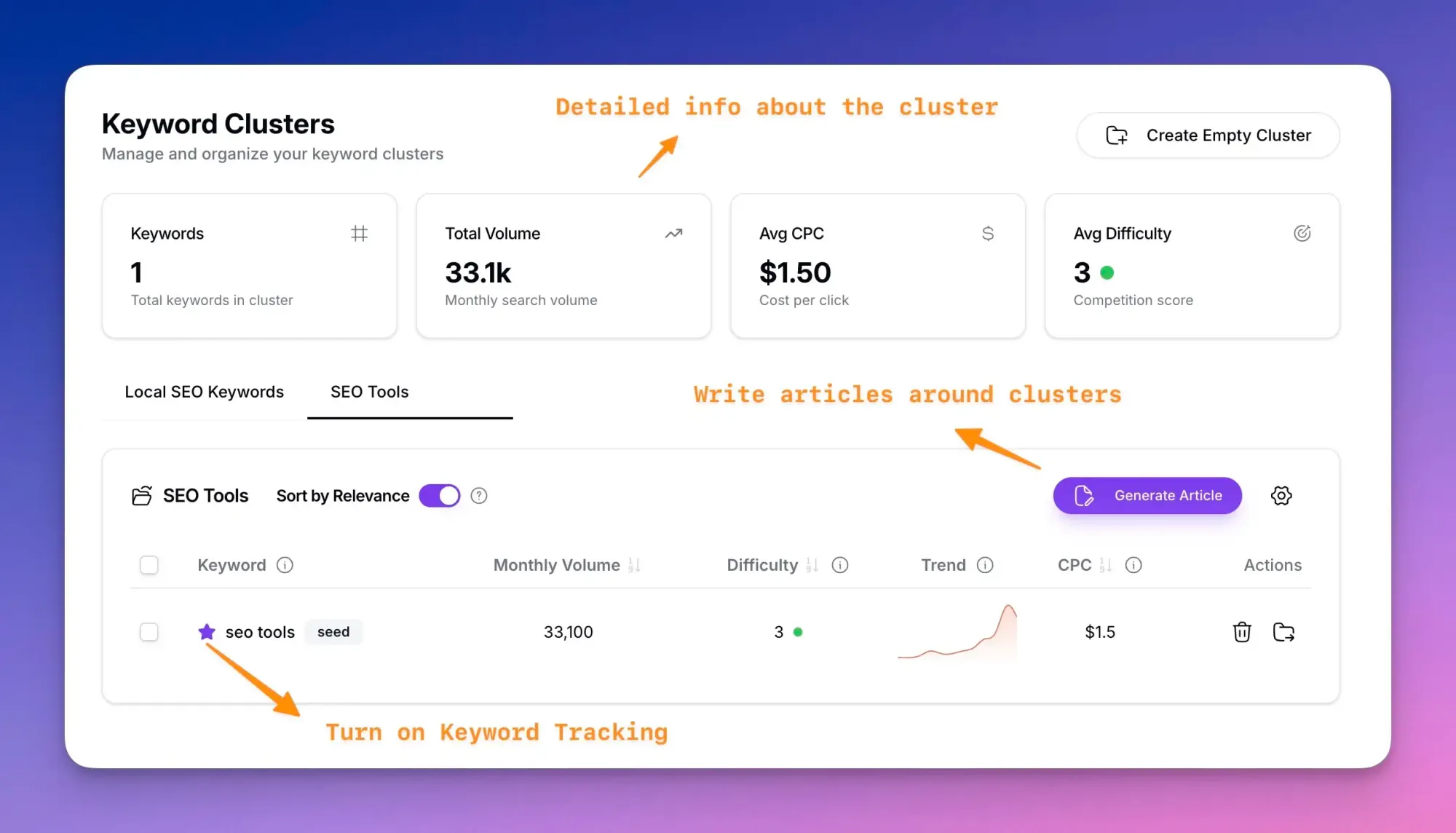 Our AI automatically groups related keywords into semantic clusters, helping you: